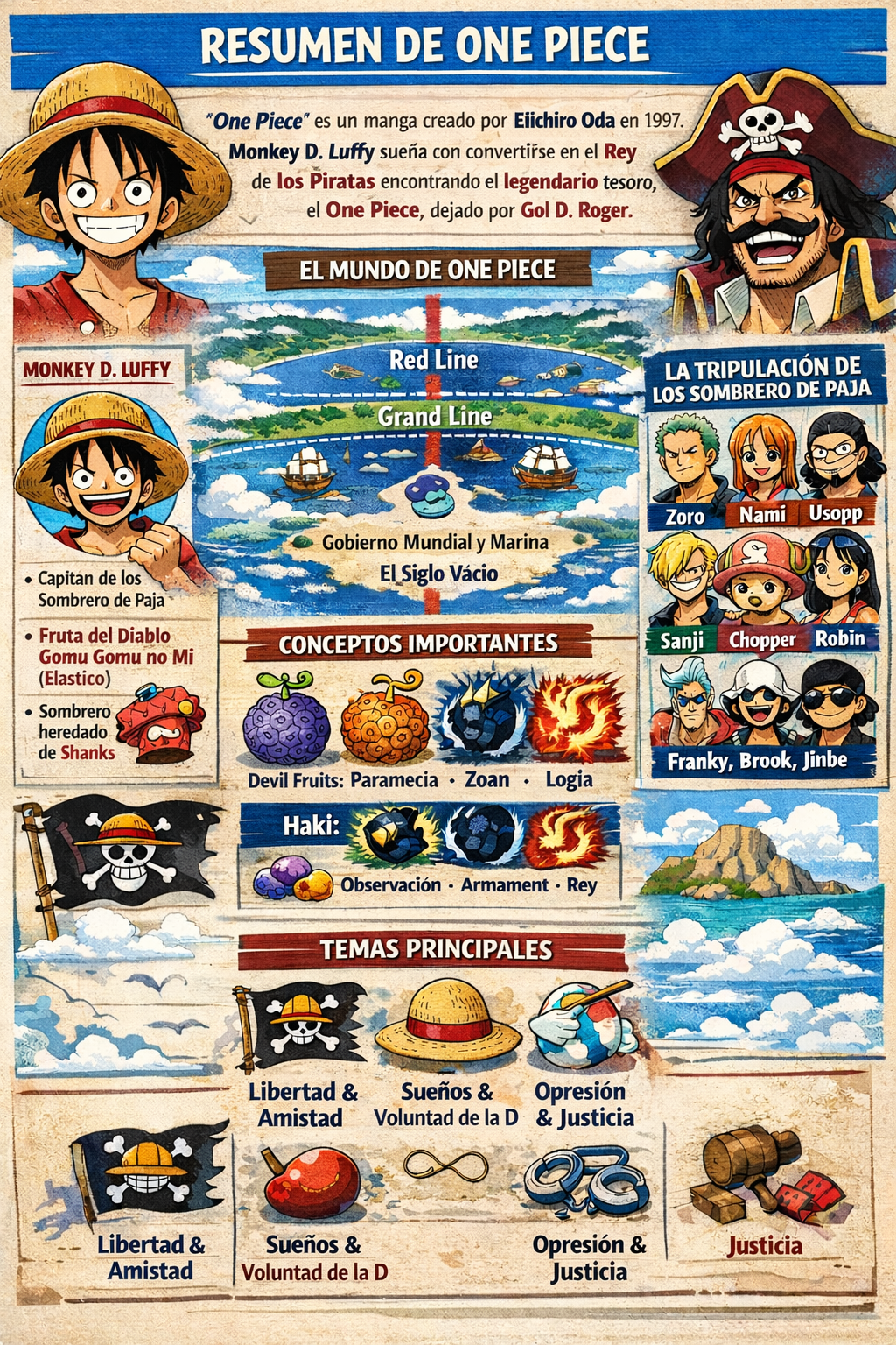 Conocimiento del Manga: "One Piece" es una de las series de manga más populares y longevas. Conocer su historia, personajes y conceptos te permite participar en conversaciones sobre cultura pop y entender referencias en otros medios.