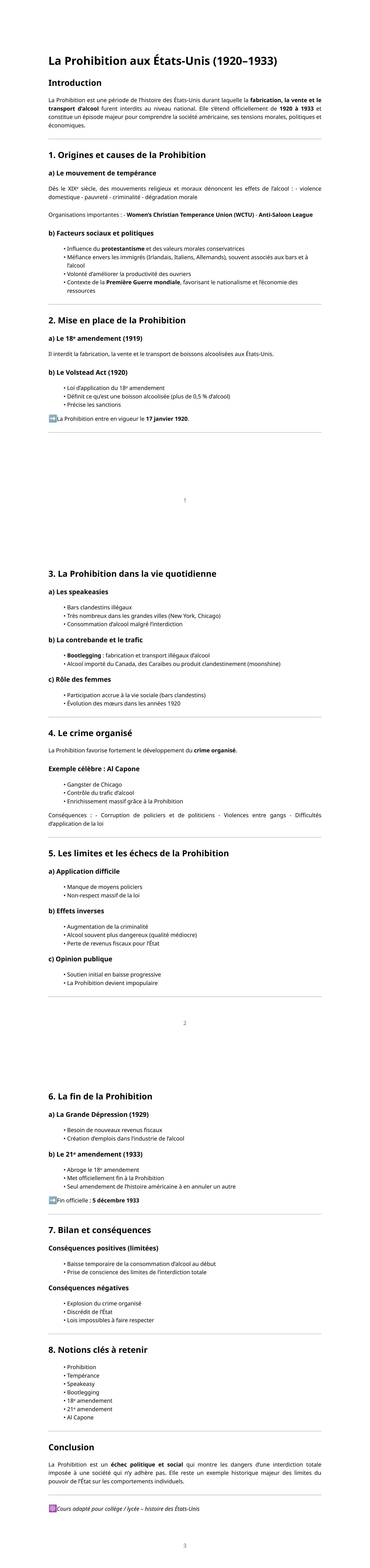 - Comprendre les causes et motivations derrière la mise en place de la Prohibition, notamment les mouvements de tempérance et les facteurs socio-politiques. - Explorer les impacts sociaux de la Prohibition, tels que l'essor des speakeasies, la contrebande d'alcool et le rôle des femmes dans la société de l'époque. - Analyser le développement du crime organisé, illustré par des figures emblématiques comme Al Capone, et comprendre comment la Prohibition a influencé la criminalité. - Évaluer les limites et les échecs de cette politique, y compris les effets inverses et l'opinion publique changeante. - Découvrir la fin de la Prohibition et ses conséquences, notamment la réintroduction de l'alcool et les impacts économiques.
